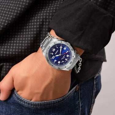 Seu mostrador sofisticado oferece leitura clara das horas e calendário, enquanto o mecanismo quartz garante precisão e baixa necessidade de manutenção. O vidro em cristal mineral proporciona maior resistência a riscos, e a resistência à água de até 50 metros traz segurança para as atividades do dia a dia.